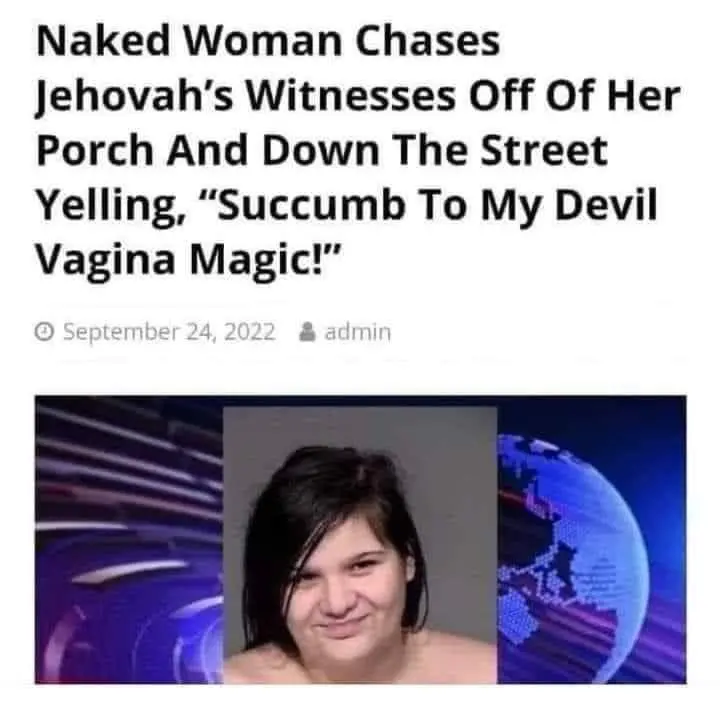 Edit: sorry, thought it included the link. https://dailynewsreported.com/positive-affirmations/woman-chases-jehovahs-witnesses-down-the-street-yelling-succumb-to-my-devil-vagina-magic/ I have to shamefully admit I ate the onion