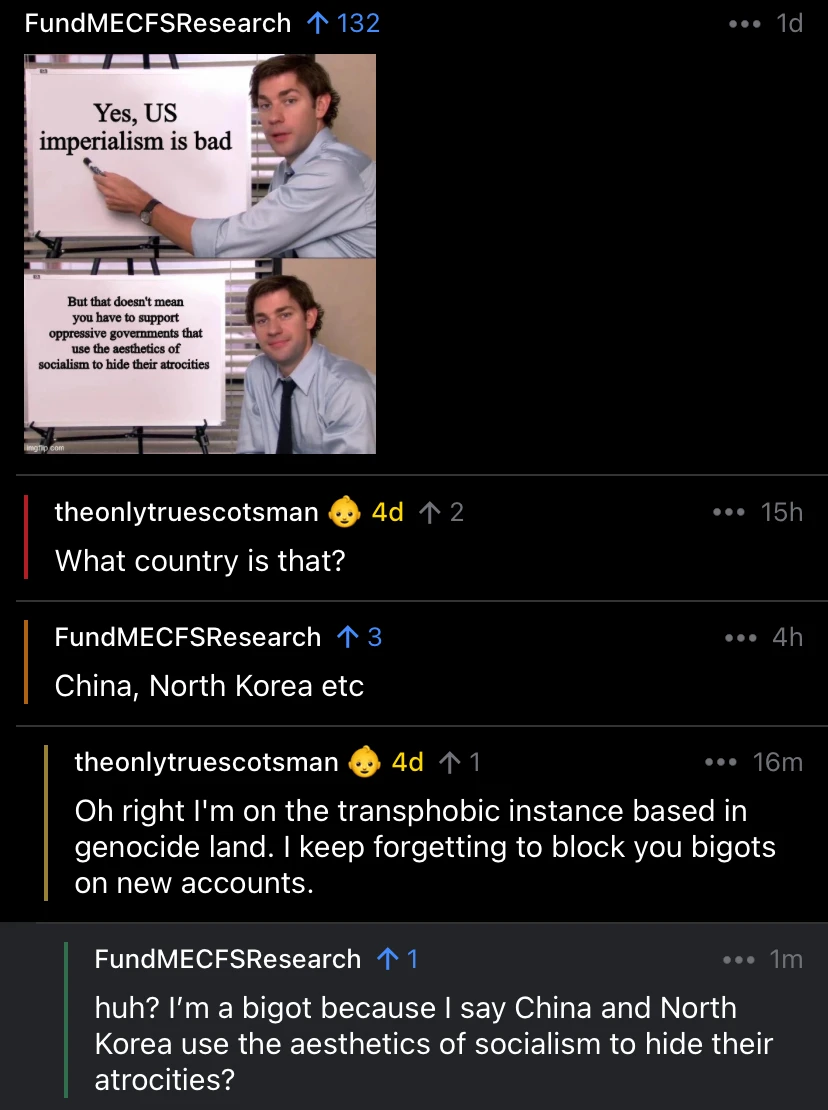 FundMECFS@lemmy.blahaj.zone to MeanwhileOnGrad@sh.itjust.worksEnglish · edit-21 year agoConfusing encounter. Did I misunderstand something, or did this person call me a bigot for mentoining China and North Korea have committed atrocities?lemmy.blahaj.zoneimagemessage-square84linkfedilinkarrow-up1242arrow-down112