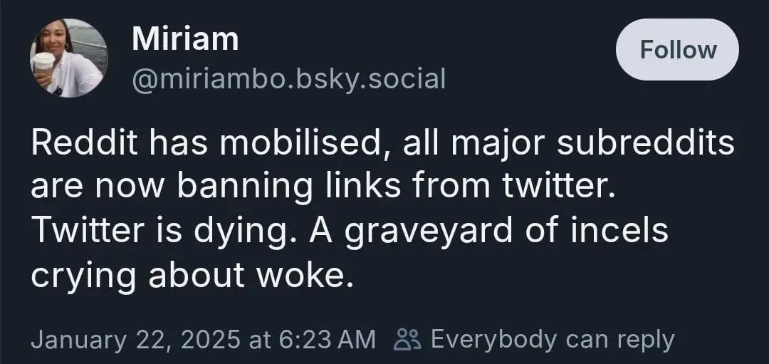 For those out of the Reddit loop (good!), the frontpage is full of subreddits banning Twitter links. Some even ban Facebook, Instagram, and Threads.