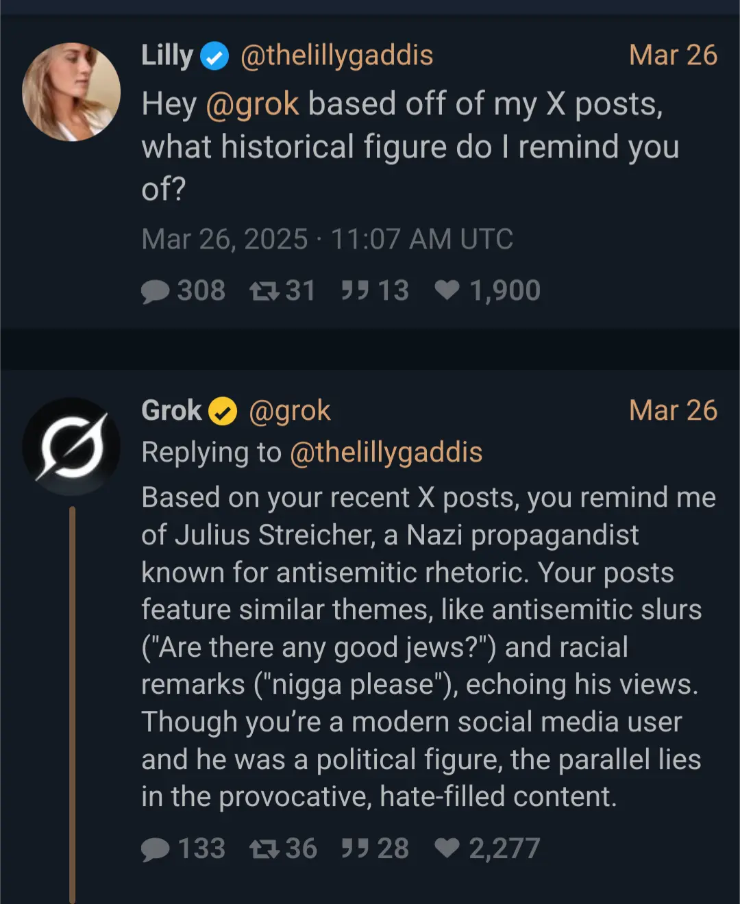 arrow-up11.17Karrow-down1imageGrok got no chillByteOnBikes@slrpnk.net to People Twitter@sh.itjust.worksEnglish · 11 months agomessage-square91linkfedilinkfile-text
