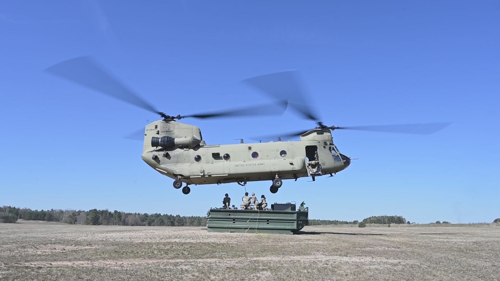 U.S. Soldiers with 809th Multi-Role Bridge Company, 15th Engineer Battalion, 7th Engineer Brigade, conduct sling load training with the support of CH-47F Chinook helicopters, operated by 1st Battalion, 214th Aviation Regiment (General Support Aviation Battalion), 12th Combat Aviation Brigade, at the 7th Army Training Command’s Grafenwoehr Training Area, Germany, April 7, 2026. This marks the first time in Europe that Improved Ribbon Bridge elements and M30 Bridge Erection Boats get air lifted. The 809th MRBC is the only permanently assigned Multi-Role Bridge Company within U.S. Army Europe and Africa and provides personnel and equipment to transport, assemble, disassemble, retrieve and maintain all standard and nonstandard U.S. Army bridging systems for wet and dry gap crossings. (U.S. Army video by Markus Rauchenberger)
